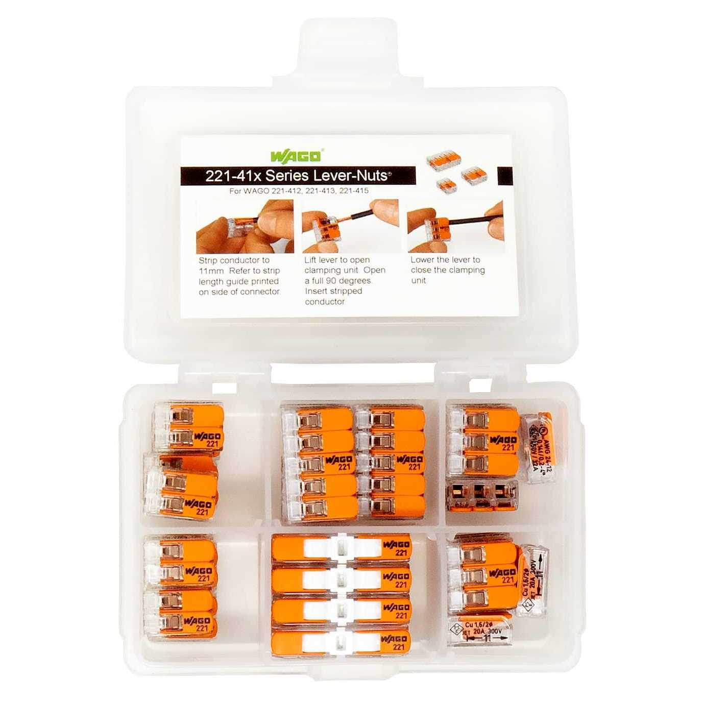• Includes: 10x 221-2401 (2 conductor inline), 10x 221-412 (2 conductor), 10x 221-413 (3 conductor), 5x 221-415 (5 conductor) with case