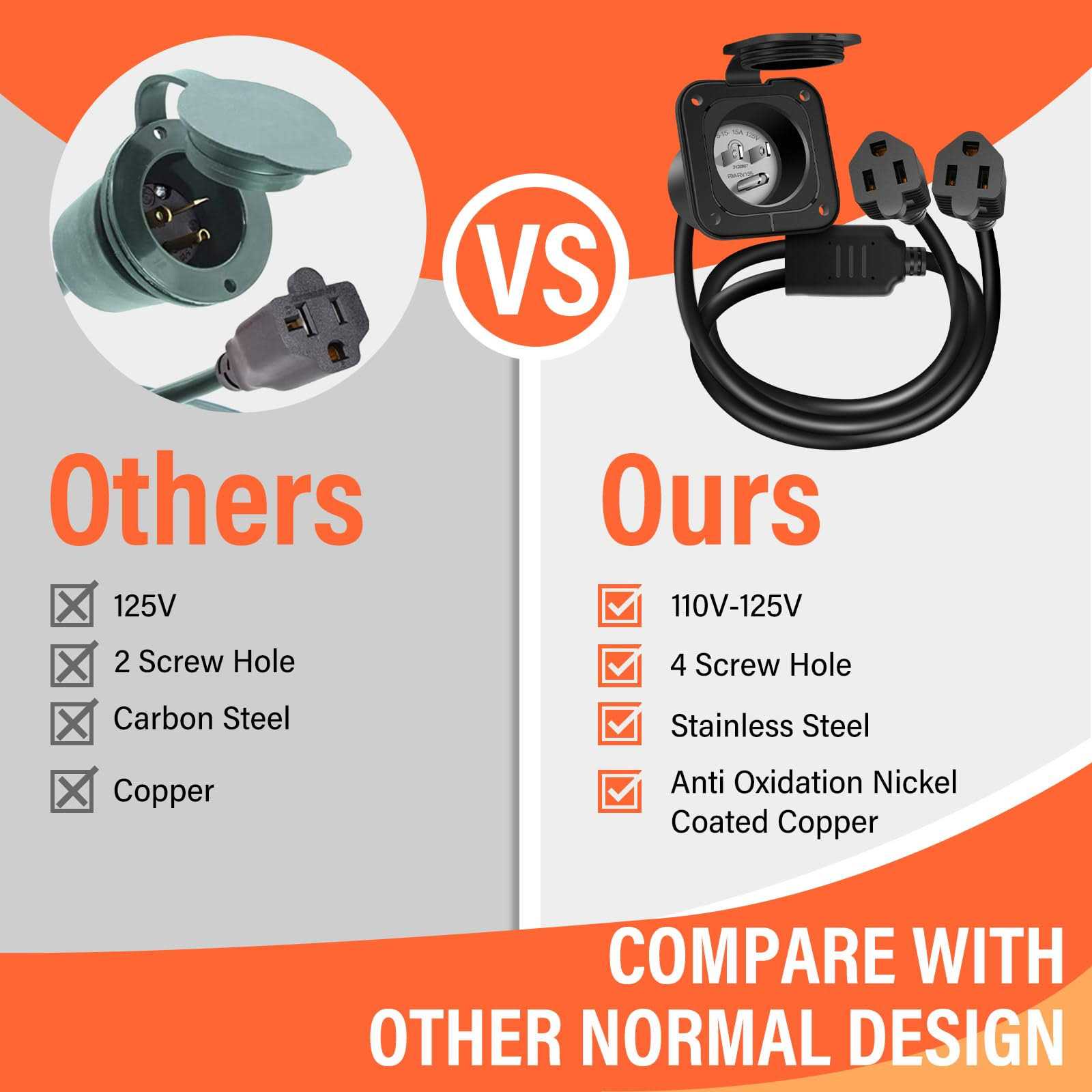 【15 Amp Flanged Inlet】: No oxidation for the Nickel coated copper pole on the plug, made of premium copper and Nylon plastic to avoid the damage of UV degradation and chemicals, rugged and durable for indoor and outdoor. 【Easy Reliable Installation】: 2″ Hole size required, 4 long Stainless Steel screws will fix straight blade flanged inlet on the hole or wall more tightly. No gap on the edge! 【 Weatherproof Cover】: ETL approved, and the rv electrical outlet cap and back cover will protect it from the rain storm, snows, dust and even works well in Western Colorado winters, without crack and leak. 【No Need to Wire Up】 : The male receptacle is already wired up by 2 x 14AWG 18 inch extension cable with NEMA5-15R. Just plug in to connect the power. 【Widely Compatible】: As a generator or battery charger plug to energize your electrical devices. Widely used in trailer, camper, RV, car, boat, marine, block heater,home, bumper, recessed outlet box, etc AC port plug power inlet with dual integrated 18-inch extension cord.