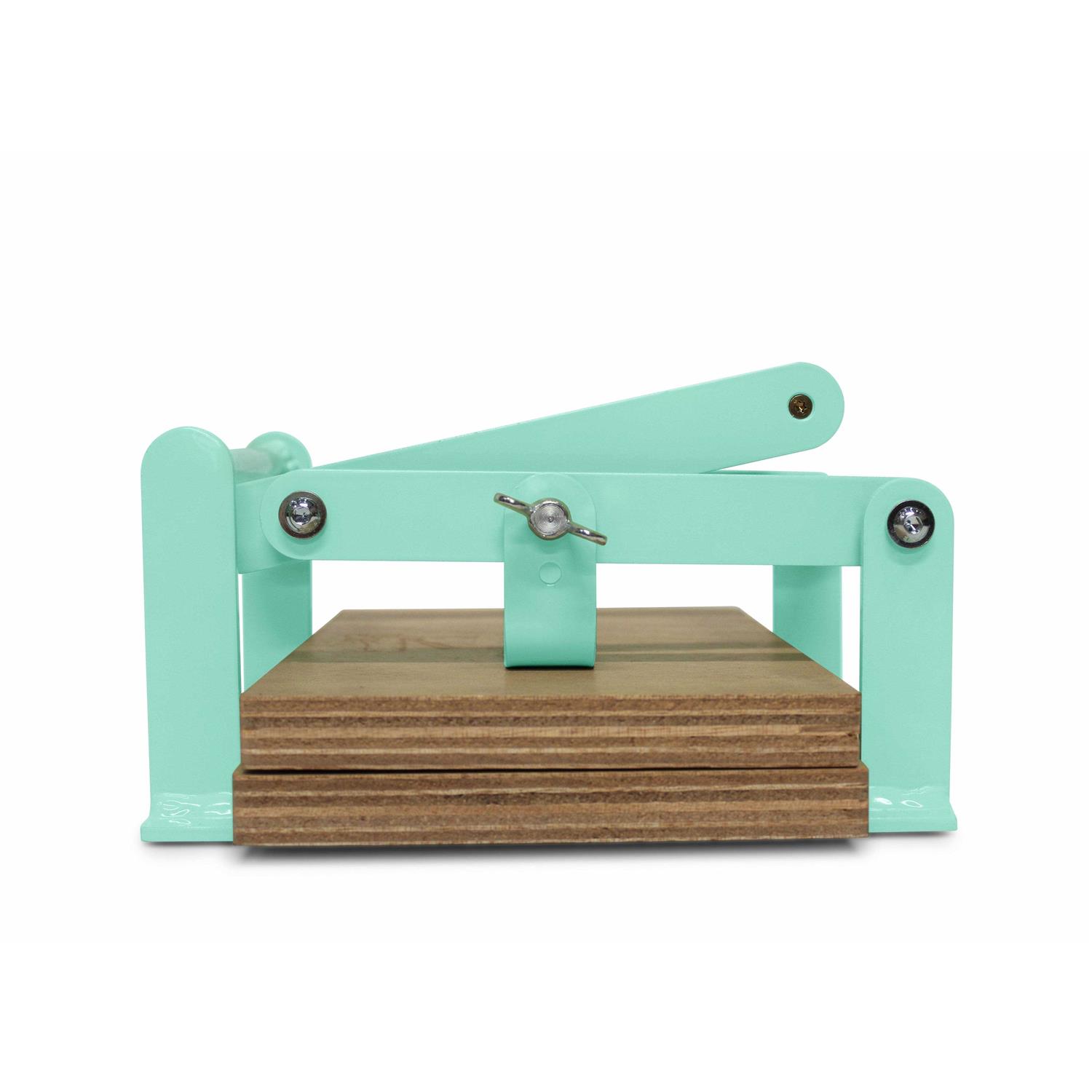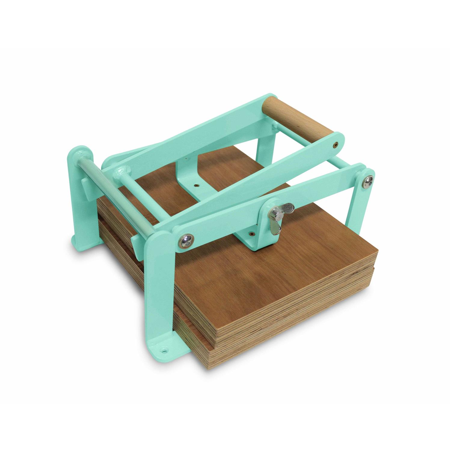 The smallest press in the Woodzilla range, affordable but still the quality and printing results you can expect from a Woodzilla press. A heavy duty hand operated Lino press, with 18 mm press plates. The press is suitable for DIN A5 (5,8 x 8,3 inch, junior legal+)size Lino cuts, but can also be used for flower pressing, woodcut printing, paper stamping, etc. Its steel frame is fully welded and has a mint green powder coating finish, which is very durable and easy to clean. The pressing plates have a 3-layer PU-lacquer semi-gloss finish. When working with thicker materials, the upper plate can be raised by means of the 2 wing-screws. Anti-skid shoes under the press prevent the press from skidding. During pressing this press is very stable. When not in use, simply place the press upright so it will take up little space in your workshop! This is a brilliant piece of equipment for any printmaker, especially when printing smaller paper sizes and cards or when you just discovered printmaking. Simple and easy to use.