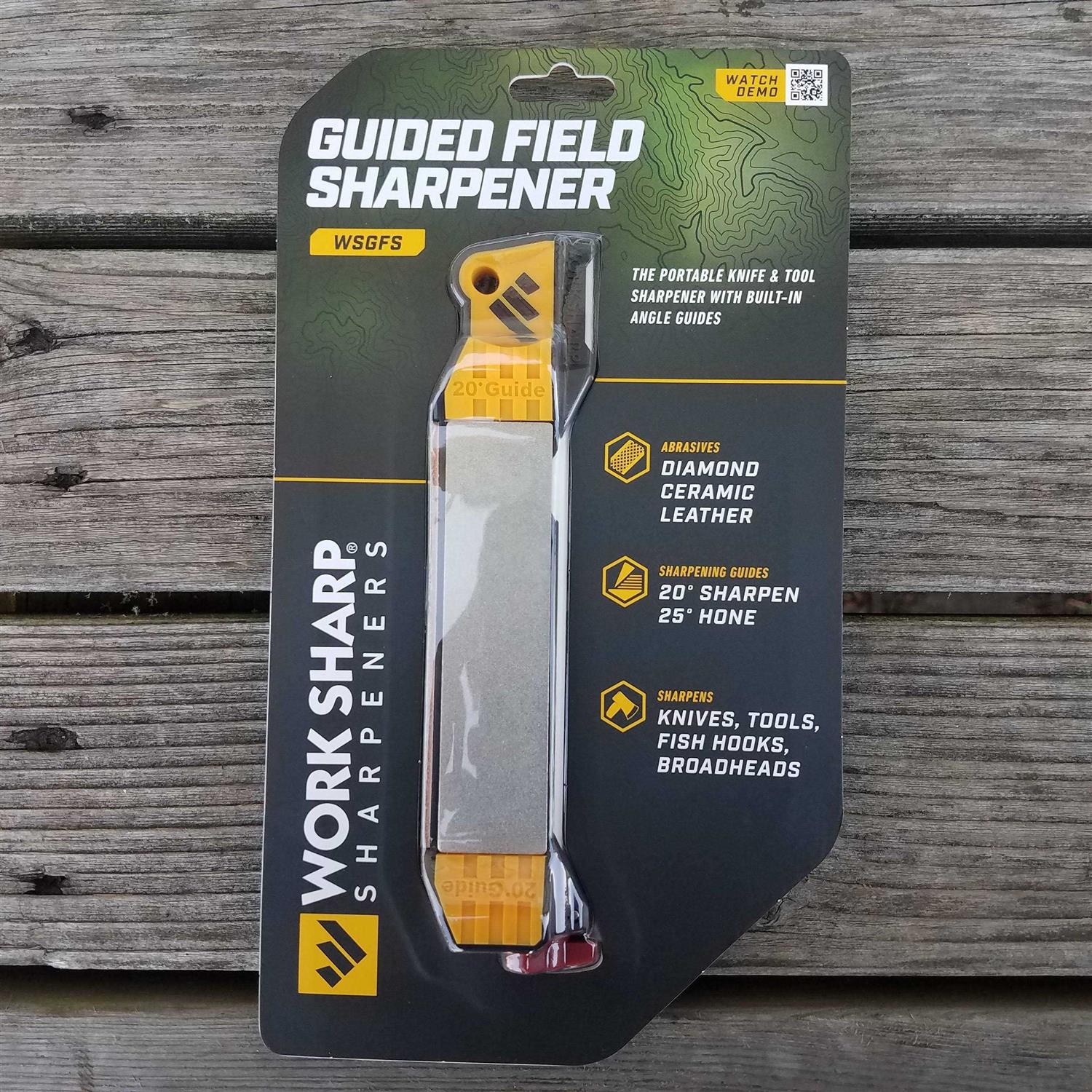 Guided field sharpeners A compact sharpener designed specifically for use in the field. 5 abrasive steps provide the complete sharpening solution. Built in angle guides ensure a consistent bevel angle across the entire edge of a blade. All elements are self contained and require no set-up or assembly in the field. Sharpens: standard knives, serrated knives, scissors, broad heads, fish hooks, garden tools, axes and machetes and more.