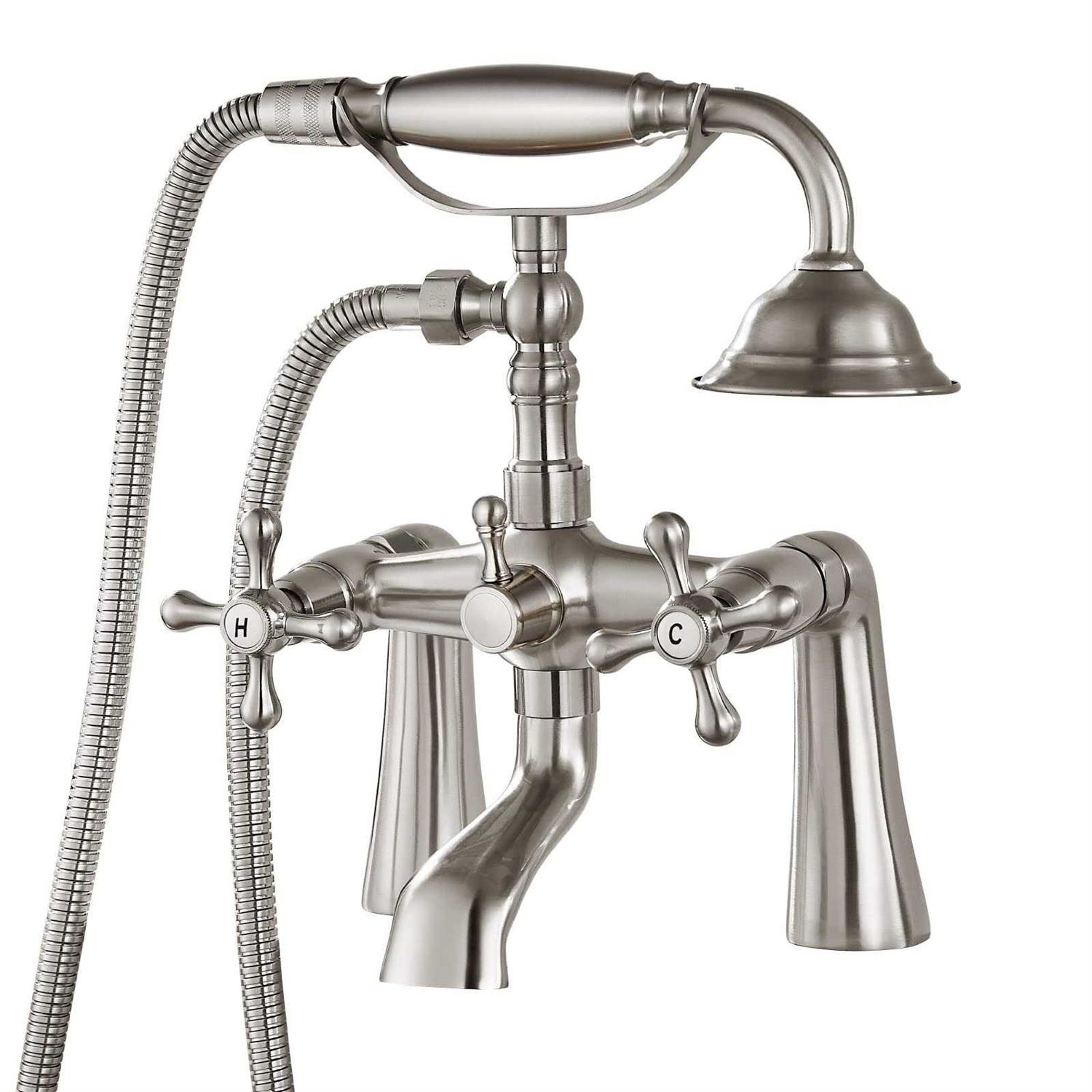 Deck Mount Tub Bathtub Clawfoot Faucet with Handheld Shower Brushed Nickel Telephone Shaped Sprayer Showerheld Double Cross Handle